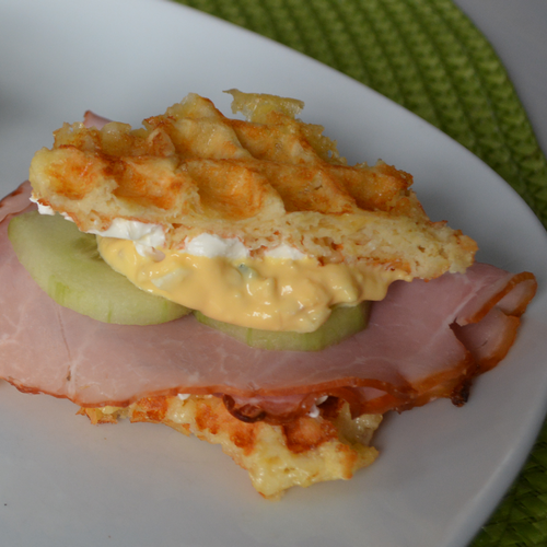 Diese Käsewaffeln eignen sich hervorragend als knusprige Sandwich-Brote. Ich bevorzuge meine Sandwichs mit etwas Frischkäse bestrichen, gekochten Schinken und Gurke belegt und einem Klecks Eiersalat als krönendem Abschluss.
